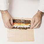 Cortar el rollo en ocho porciones. Servir acompañado de trozos de pescado crudo (sashimi) y salsa de soya.